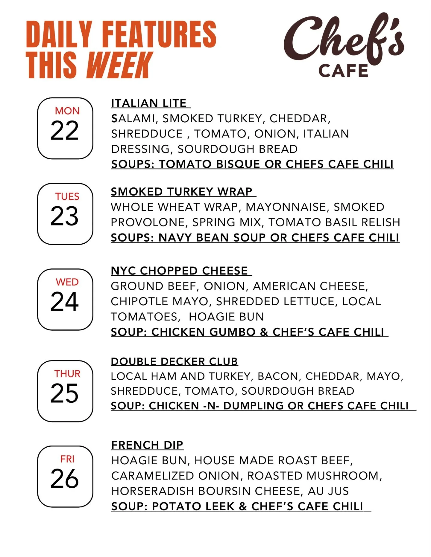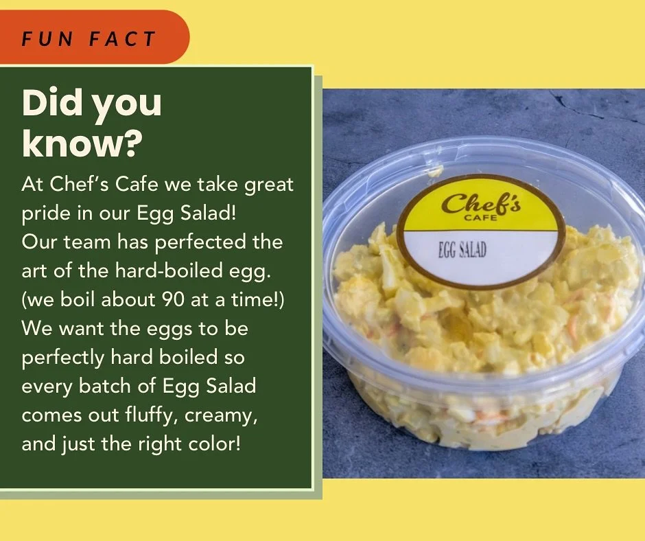 Our Chicken Salad is a family recipe passed down for generations, made in small batches and hand mixed. What makes Chef’s Cafe special isn’t just the food, but our focus on welcoming our guests, so they feel valued and part of our “family.” At Chef’s Cafe, food is more than a meal, it’s a connection. Whether you’re a regular or a first-time guest, you’re always welcome at our table.