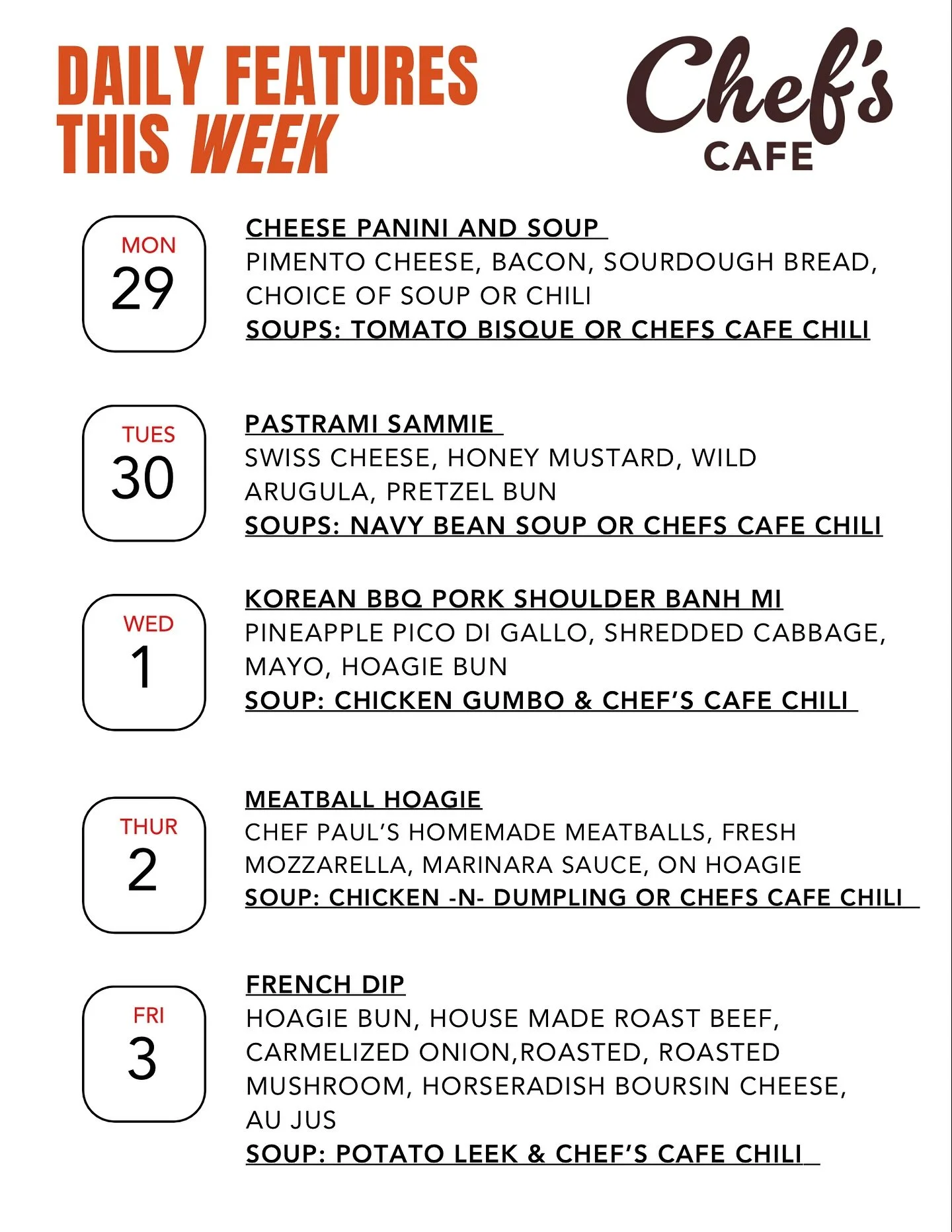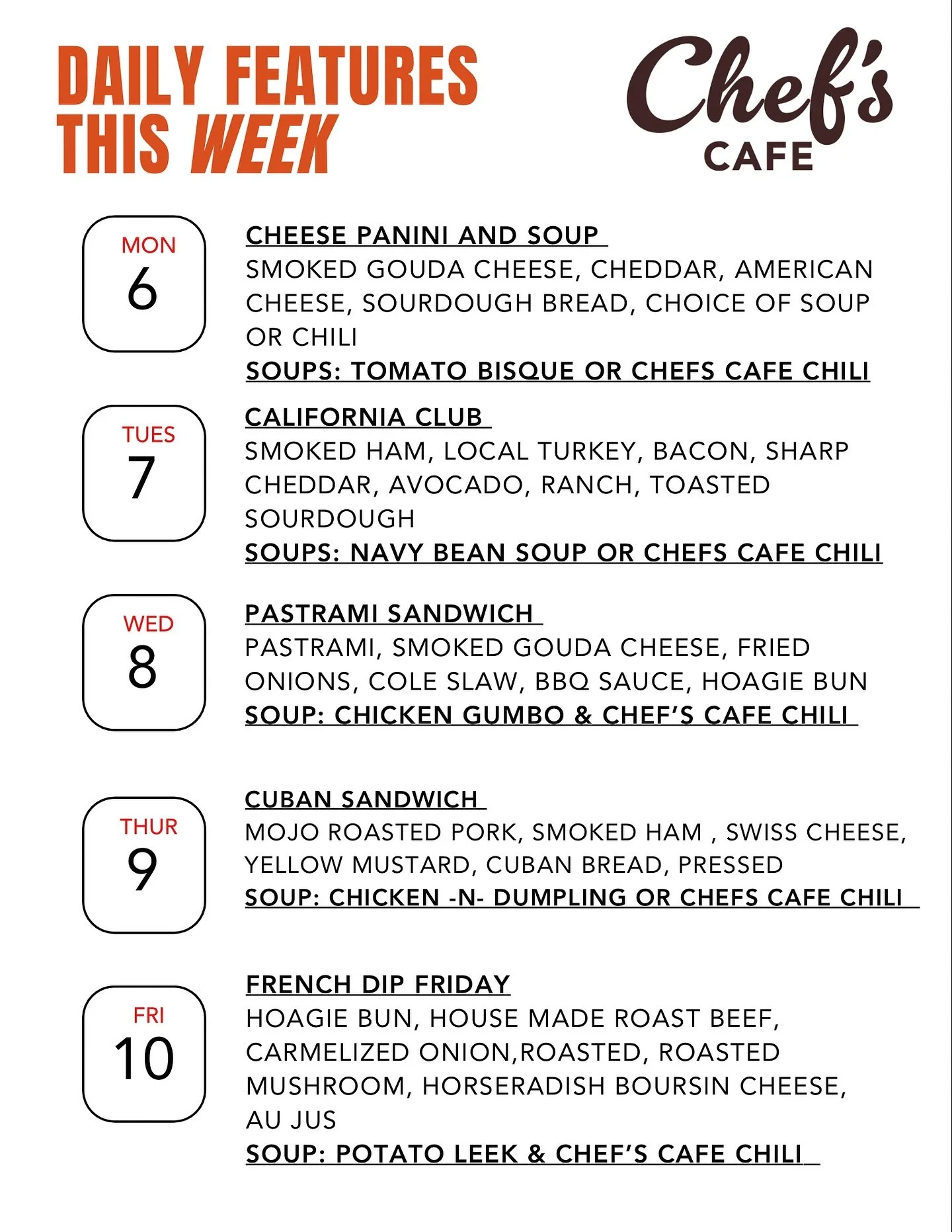 Is Chef’s Cafe open on the weekends?