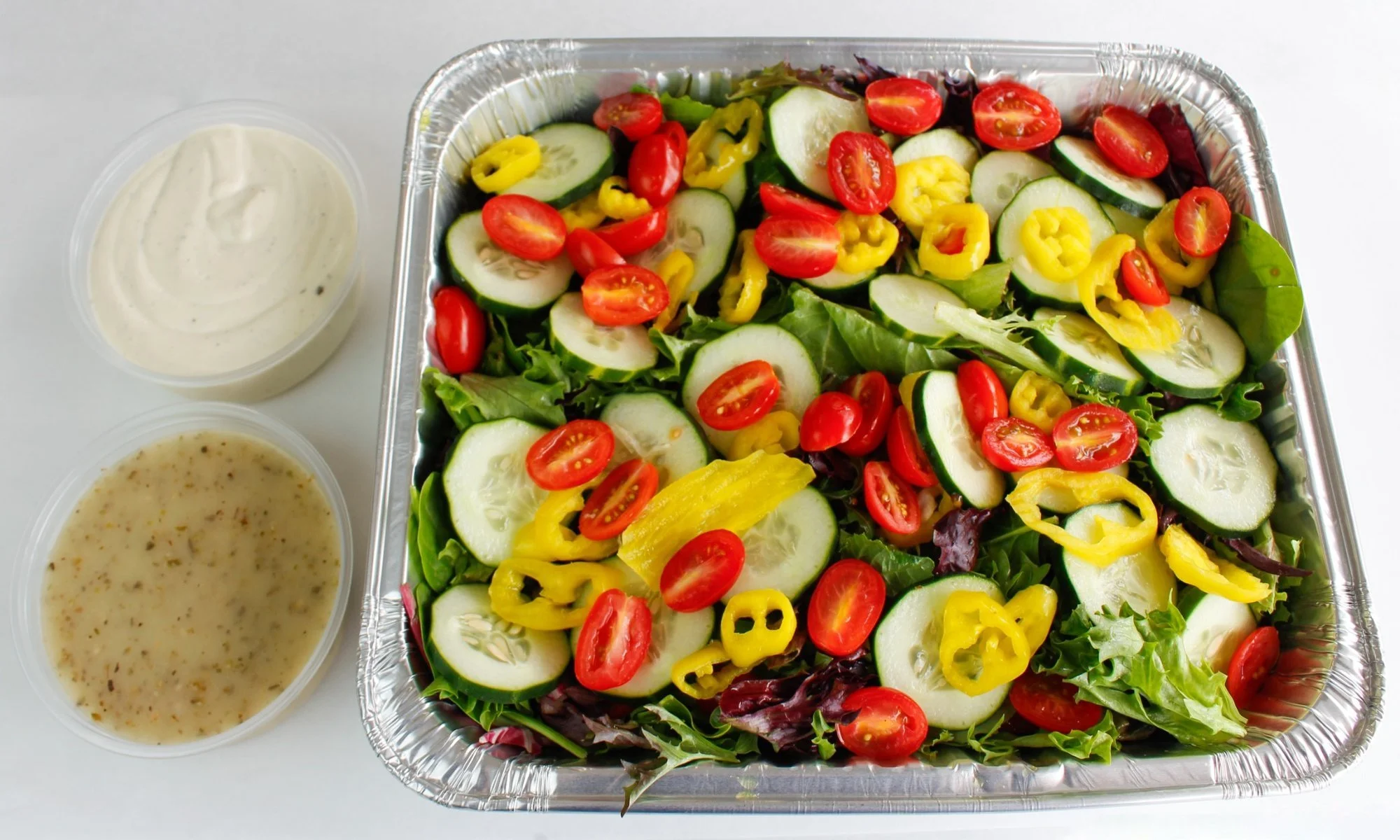Spring Mix, Cucumbers, Tomatoes & Banana Peppers . Salad Dressing Choices: Italian, Ranch, Balsamic Vinaigrette