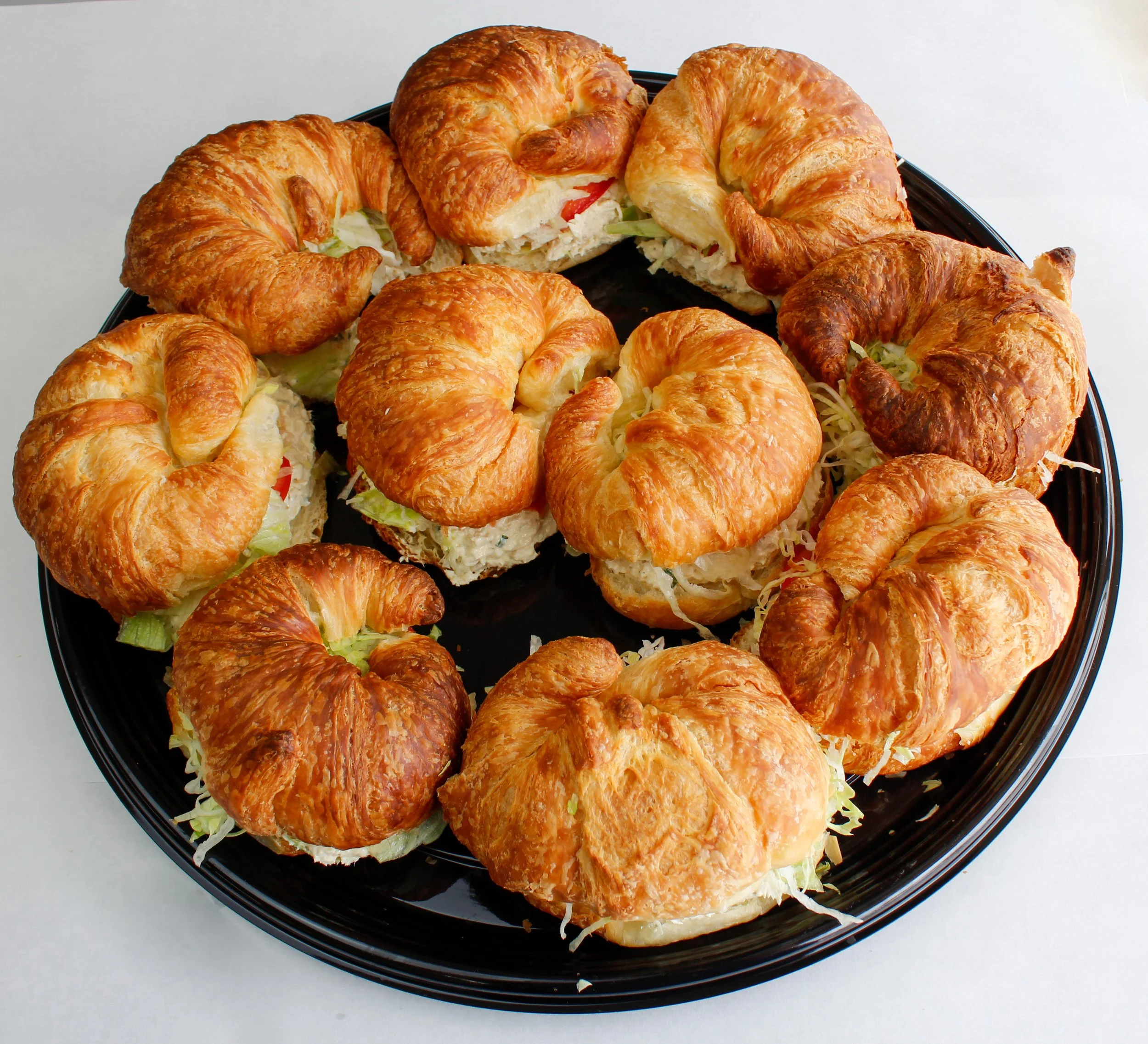 Tray of 10 Sandwiches on Fresh Baked All-Butter Croissants with Shredded Lettuce and Tomato, Condiments on Side.